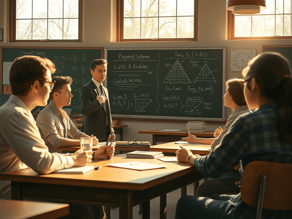 Arrivò il nostro professore di matematica, un tipo burbero, che amava farci capire le cose in modo pratico. In classe, ci spiegò come funzionava uno schema piramidale: dal punto di vista matematico e del suo inevitabile fallimento. Ci mostrò che, prima o poi, la catena si sarebbe interrotta. I primi dello schema avrebbero guadagnato, mentre gli ultimi avrebbero perso soldi e la fiducia nell’umanità.